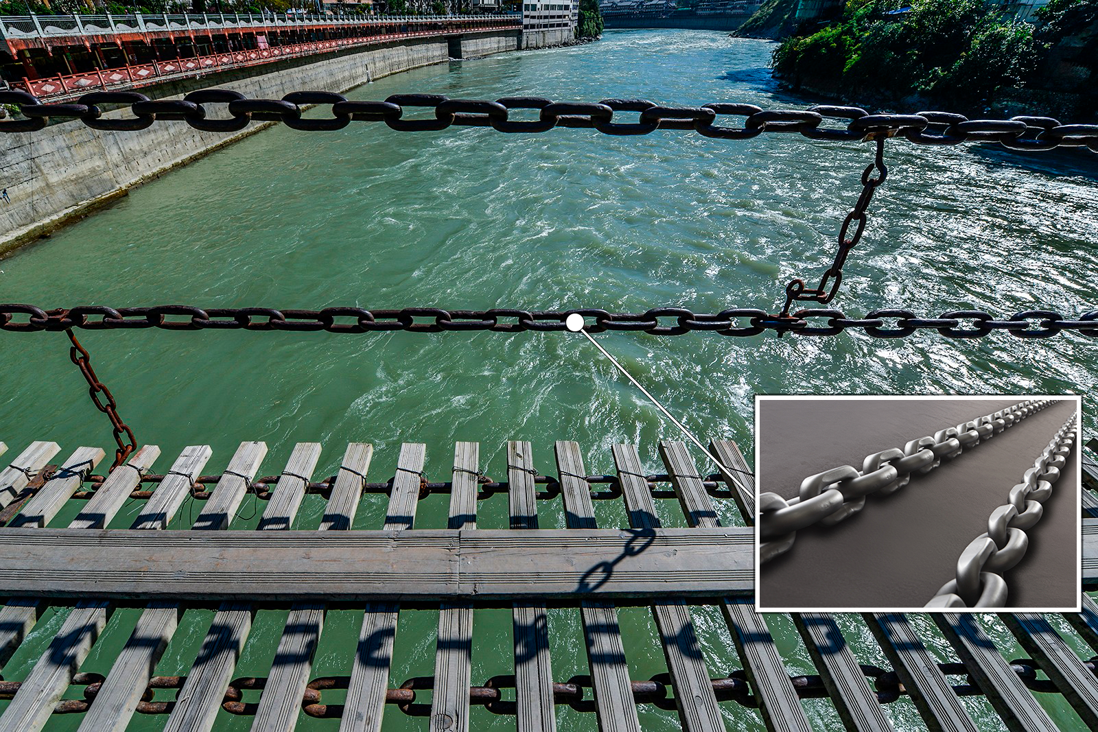 在山區(qū),由于地形復(fù)雜,道路建設(shè)難度大,鐵索橋便成為了一種重要的交通設(shè)施,除去能便利交通外,鐵索橋本身也具有一定的觀賞價值。