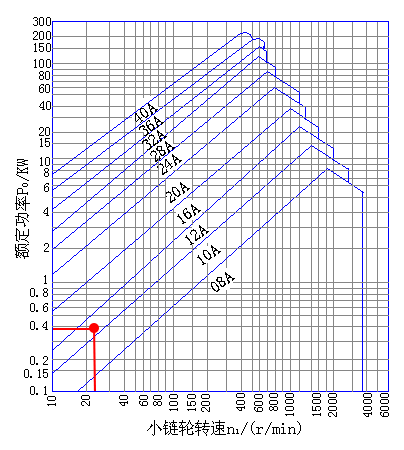 對照滾子鏈功率圖,可以知道當鏈條為12A,鏈輪齒數(shù)為21齒時符合使用條件。