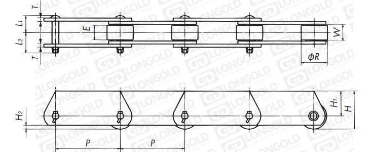 通用輸送鏈為基礎(chǔ),采用幅度較寬的鏈板和摩擦阻力較小的R滾子,在鏈板上可直接承載重量物的鏈條。是較為常用的一種輸送鏈條的形式。