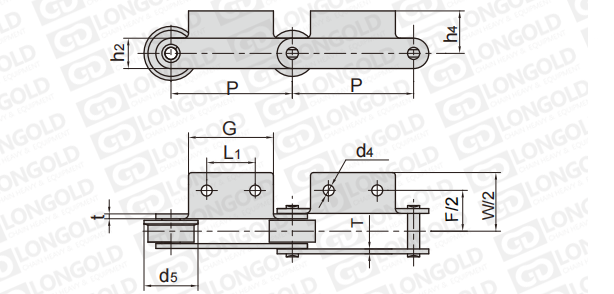 此種輸送鏈?zhǔn)怯呻p節(jié)距鏈條衍生而來的,鏈條節(jié)距為非常用規(guī)格,通過裝備標(biāo)準(zhǔn)附件或非標(biāo)附件使鏈條滿足特定的工作需求。