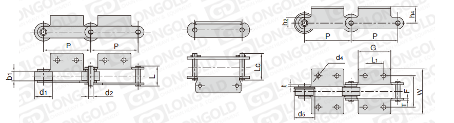 此種輸送鏈是由雙節(jié)距鏈條衍生而來的,鏈條節(jié)距為非常用規(guī)格,通過裝備標準附件或非標附件使鏈條滿足特定的工作需求。