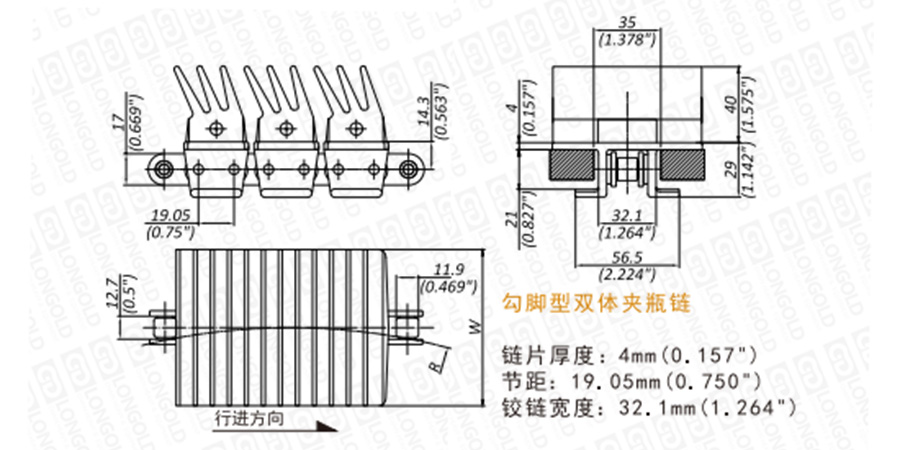 免加油自潤滑鏈條無需定期潤滑,多種規(guī)格的橡膠墊為每一種具體的應用施加理想可控的作用力,由滾花的奧氏體不銹鋼銷軸構(gòu)成鏈片和夾爪的可靠系統(tǒng)。EW1873T系列鏈條為勾腳型雙體夾瓶鏈。鏈片為塑料材質(zhì),鏈片上有橡膠材質(zhì)的長齒,長齒結(jié)構(gòu)在發(fā)生彎曲變化時不會對產(chǎn)品和傳送線增加壓力,適合于輸送空玻璃容器類產(chǎn)品。