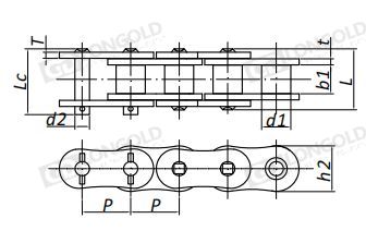 鏈條的鏈板形狀與SP系列高強(qiáng)度滾子鏈相同,鏈板厚度加厚,為A系列對(duì)應(yīng)的下一級(jí)較大節(jié)距鏈條的鏈板厚度。