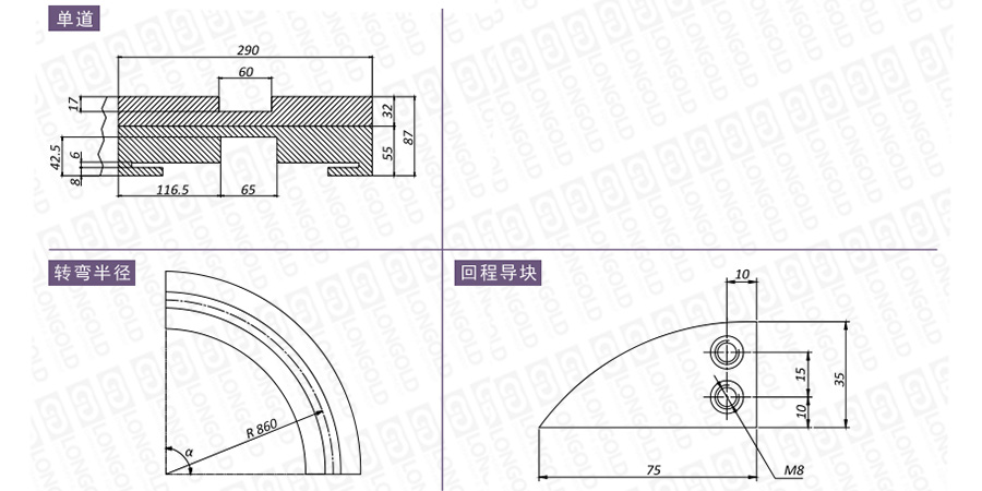 在選擇軌道時(shí),需要考慮安裝尺寸、材質(zhì)性質(zhì)、轉(zhuǎn)彎角度等因素,如有需要,請咨詢隆德技術(shù)人員。