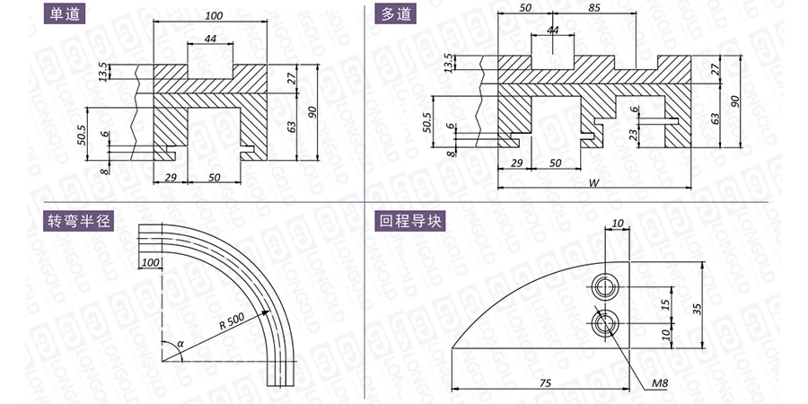 在選擇軌道時,需要考慮安裝尺寸、材質(zhì)性質(zhì)、轉(zhuǎn)彎角度等因素,如有需要,請咨詢隆德技術(shù)人員。