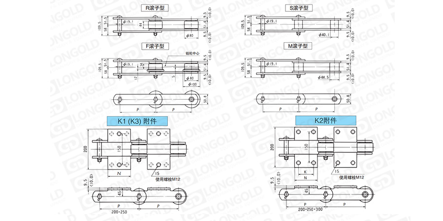 (2)滾子形式:R=大滾子  S=小滾子  F=F滾子 M=M滾子