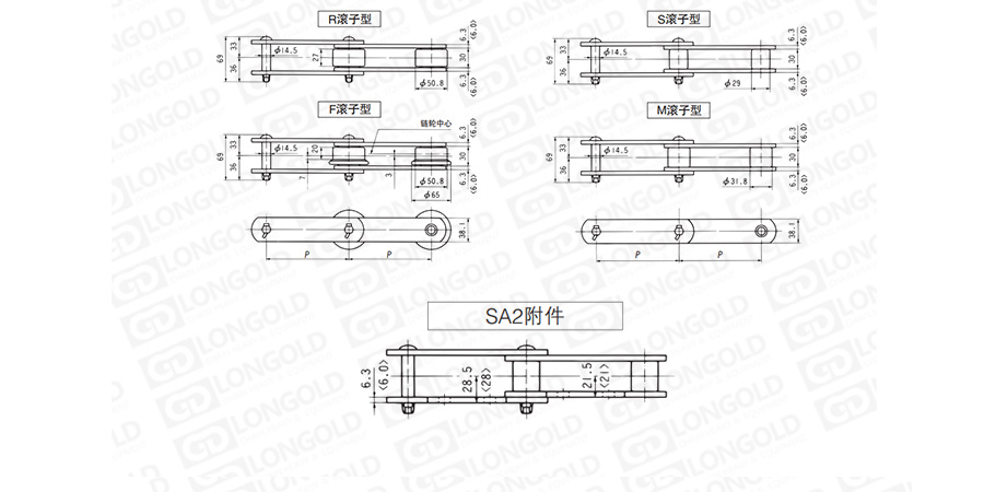 上圖為帶SA2附件LDC10100~LDC10150規(guī)格輸送鏈的結(jié)構(gòu)圖以及帶附件結(jié)構(gòu)圖。