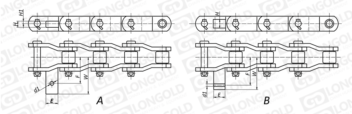 附件可配裝在每一個(gè)鏈節(jié)以上的鏈節(jié)間隔,如每偶數(shù)鏈節(jié)安裝,為了容易進(jìn)行保養(yǎng),安裝在外鏈節(jié)。