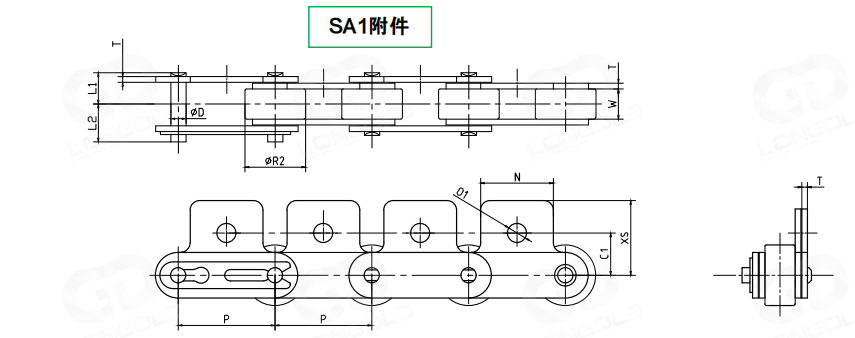 使用超級工程塑料制滾子,本體為不銹鋼鋼制的雙倍節(jié)距鏈條。在套筒和滾子之間可無加油使用。實(shí)現(xiàn)了輕量化和低噪音化。鏈條單側(cè)鏈板向上延伸作為附件,附板上帶有一個(gè)或者兩個(gè)螺孔,附件表示為:SA1和SA2。