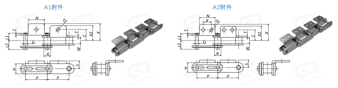 將普通A類(lèi)滾子鏈的節(jié)距翻倍、鏈板采用平板的帶附件輸送鏈。在鏈條的單側(cè)加裝折彎板附件,附件板上有1個(gè)或者2個(gè)螺孔,附件表示為:A1或者A2,且螺孔的大小是特殊定制。