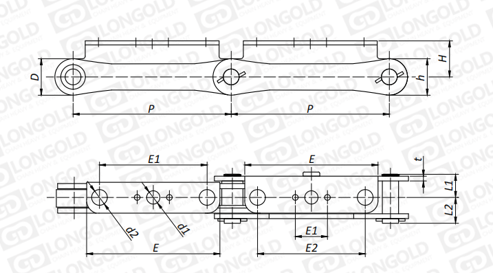 鏈條每節(jié)都附帶內(nèi)彎附件,附件帶三個孔。