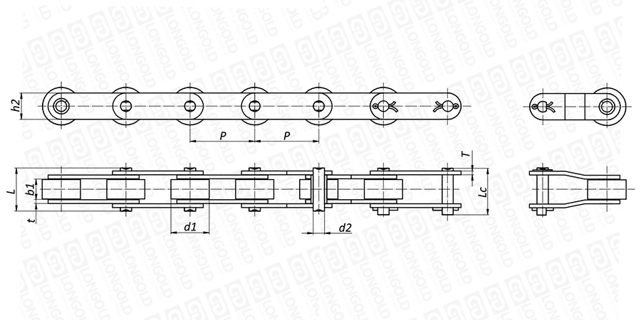 上圖為不銹鋼雙倍節(jié)距鏈直板型帶大滾子本體的結(jié)構(gòu)圖。