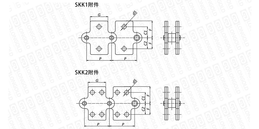 上圖為不銹鋼雙倍節(jié)距鏈帶SKK附件的結(jié)構(gòu)圖。