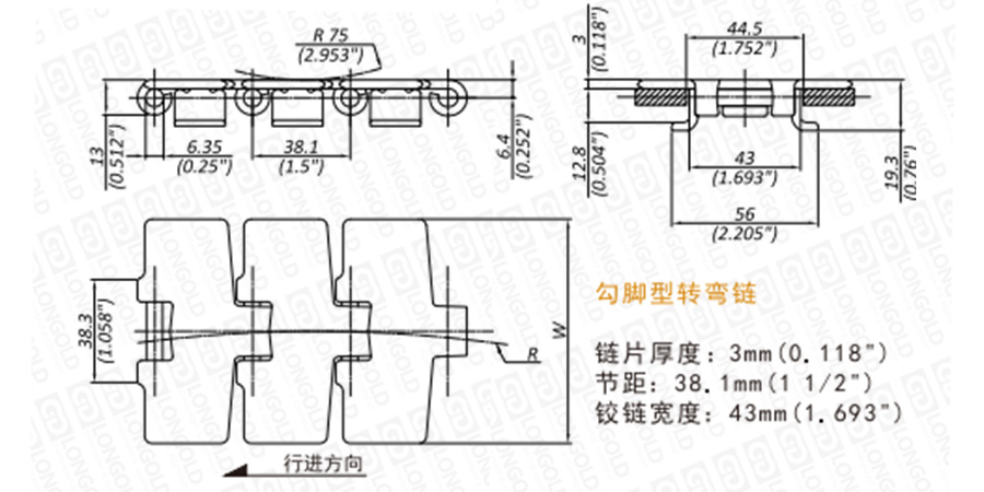 上圖為LD881T系列側(cè)彎鏈的結(jié)構(gòu)圖,圖紙已標(biāo)明本體尺寸。