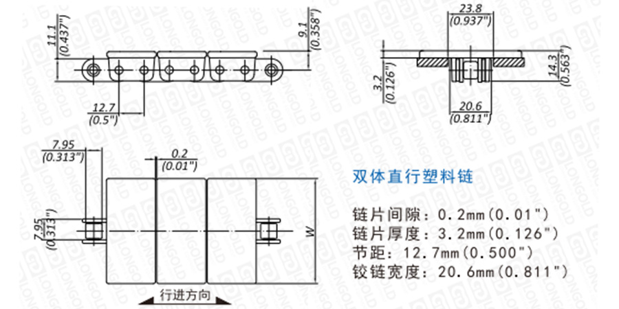 上圖為LD845系列直行鏈的結(jié)構(gòu)圖,圖紙已標(biāo)明本體尺寸。