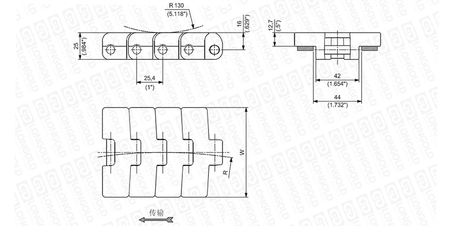 上圖為1"節(jié)距轉(zhuǎn)彎鏈板 793M系列的結(jié)構(gòu)圖,圖紙已標(biāo)明本體尺寸。
