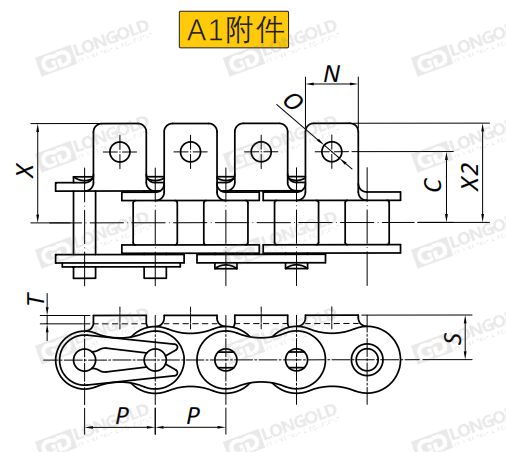 A1附件可配裝在每一個(gè)鏈節(jié)以上的鏈節(jié)間隔,如每偶數(shù)鏈節(jié)安裝,為了容易進(jìn)行保養(yǎng),安裝在外鏈節(jié)。