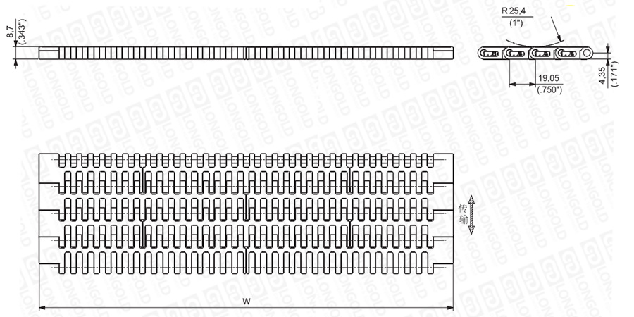 上圖為3/4"節(jié)距中載網(wǎng)帶與鏈板 7200系列,圖紙中已標明部分尺寸。