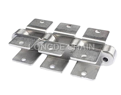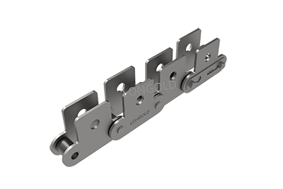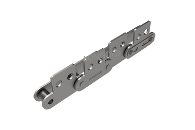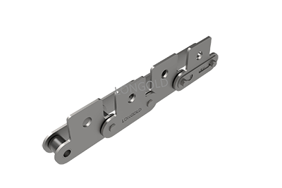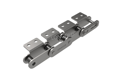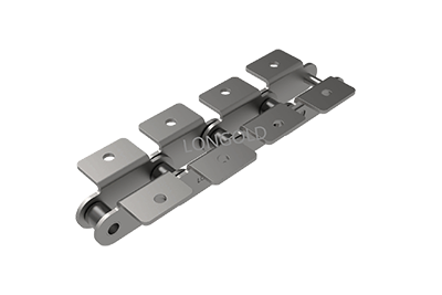 與短節(jié)距A系列滾?鏈條相?,鏈條節(jié)距增加1倍(稱為雙倍節(jié)距),鏈板形狀為直板形,鏈條的滾子分為S型滾子和R型滾子,且?guī)Ц郊妮斔?鏈條。