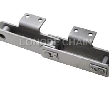 此種輸送鏈?zhǔn)怯呻p節(jié)距鏈條衍生而來(lái)的,鏈條節(jié)距為非常用規(guī)格,通過(guò)裝備特殊附件使鏈條滿足特定的工作需求
