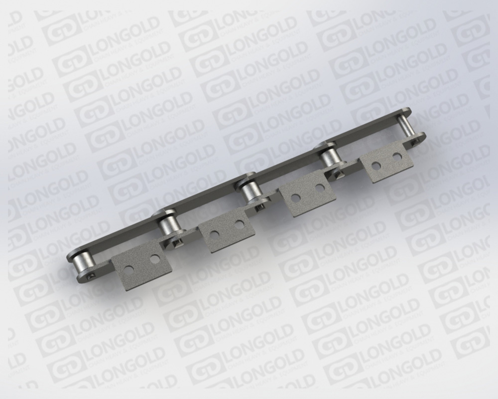 在LDC36250~LDC440600米制節(jié)距大型輸送鏈條的單側(cè)作特殊形狀和開孔的鏈條。附件是為了將夾具安裝在鏈條上的零部件,可根據(jù)客戶要求設(shè)定安裝間隔。附件表示為:GA2、GA4。