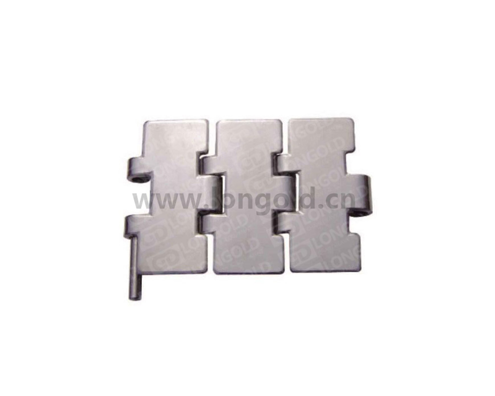 平頂鏈僅一塊兩側(cè)帶鉸卷的鏈板與一根銷軸,兩側(cè)鉸圈的一側(cè)與銷軸固定鏈節(jié),稱為固定鉸圈。另一側(cè)處在里檔的鉸圈與銷軸活動(dòng)鏈節(jié),稱為活動(dòng)鉸圈。因平行排列的頂板兩側(cè)間隙很小,所以,只能作直線移動(dòng)