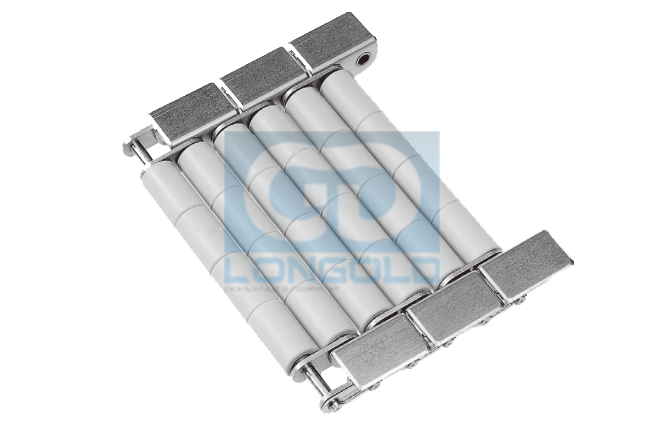 無托盤、可直接承載的自流式鏈條。塑料滾子安裝在鏈條的節(jié)線上,即使在彎曲時(shí)塑料滾子的間隔也保持不變。