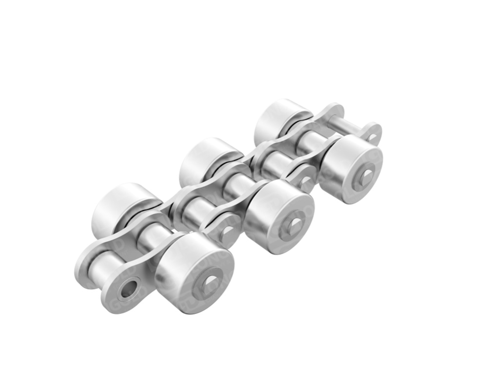帶側(cè)置滾子雙倍節(jié)距鏈?zhǔn)菍㈦p倍節(jié)距鏈的銷(xiāo)軸延長(zhǎng),在伸長(zhǎng)部分安裝可自由滾動(dòng)的滾子。側(cè)置滾子較適合將設(shè)備的更小型化。而且可安裝復(fù)數(shù)側(cè)置滾子,可將小輸送物可直接承載在輸送鏈上