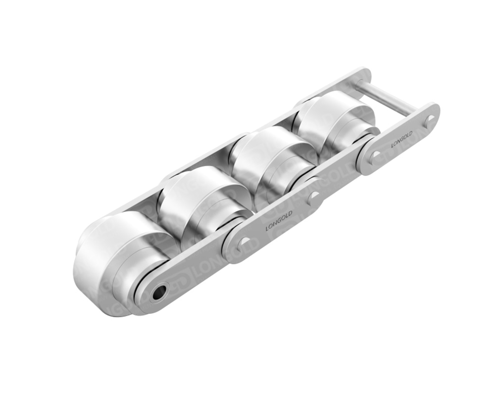 帶頂置滾輪輸送鏈設計用于在輸送系統(tǒng)中提供平穩(wěn)的物料搬運,頂置滾輪有助于減少摩擦,特別是在需要鏈條在特定角度或方向上移動的應用中。