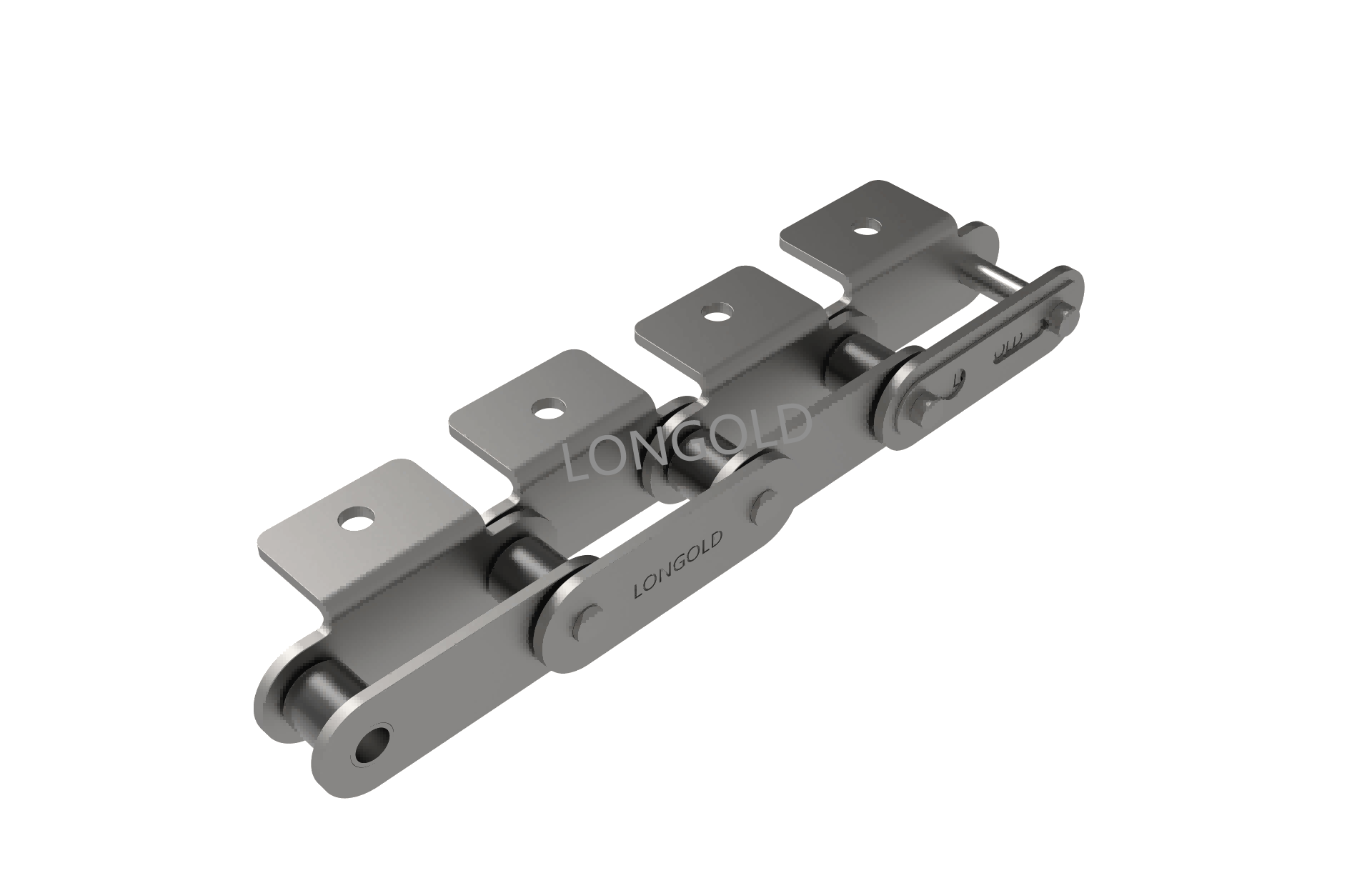 與短節(jié)距A系列滾?鏈條相?,鏈條節(jié)距增加1倍(稱為雙倍節(jié)距),鏈板形狀為直板形,鏈條的兩側(cè)帶有彎板附件,且附件上有一個(gè)螺孔的形式。依照J(rèn)IS,ISO和ASME標(biāo)準(zhǔn)。
