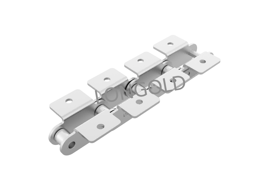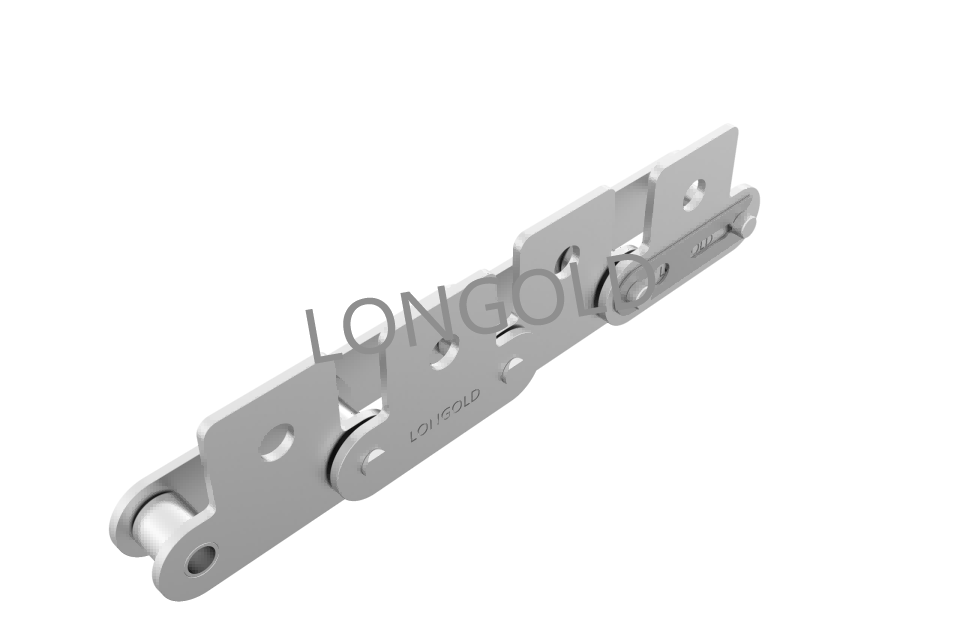 銷子和套筒之間插入特殊工程塑料制襯套,不論在干燥的環(huán)境還是淋水環(huán)境、甚至在水中也可不加油并長壽命使用的不銹鋼雙倍節(jié)距鏈條,且鏈條的單側(cè)銷軸延長的附件形式,除標(biāo)準(zhǔn)加長銷附件,也可以根據(jù)客戶需求定制非標(biāo)附件,如帶臺(tái)階的加長銷附件等。