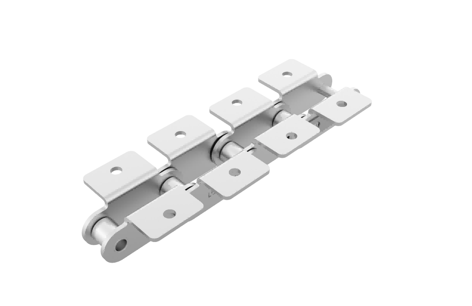 通過各種材料的組合,適合于水中、酸性及堿性等腐蝕性環(huán)境中或低溫、高溫的特殊環(huán)境里使用的帶附件雙倍節(jié)距小型輸送鏈。材質(zhì)采用相當(dāng)于SUS316,鏈條的兩側(cè)帶折彎板附件,且彎板上帶一個(gè)孔。