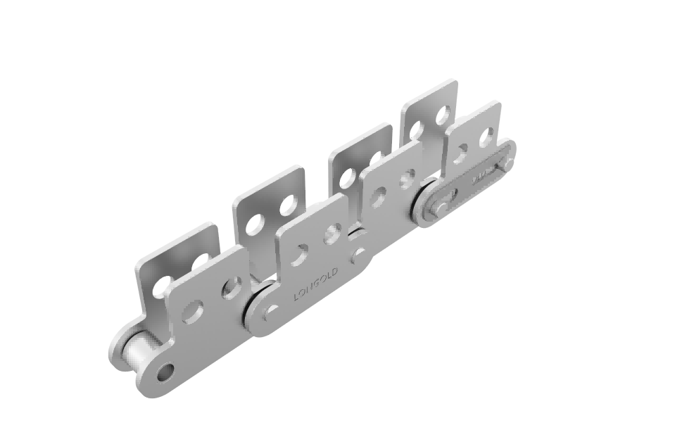 通過各種材料的組合,適合于水中、酸性及堿性等腐蝕性環(huán)境中或低溫、高溫的特殊環(huán)境里使用的帶附件雙倍節(jié)距小型輸送鏈。材質(zhì)采用相當(dāng)于SUS316,鏈條的單側(cè)帶折彎板附件,且彎板上帶一個(gè)孔。