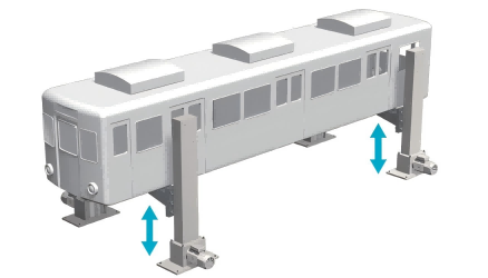 電車檢修時,可使用4臺提升機將車體抬起。