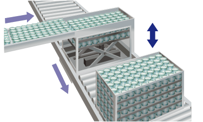 升降機(jī)按照一定的節(jié)距下降,將上方運(yùn)來的工件堆垛。