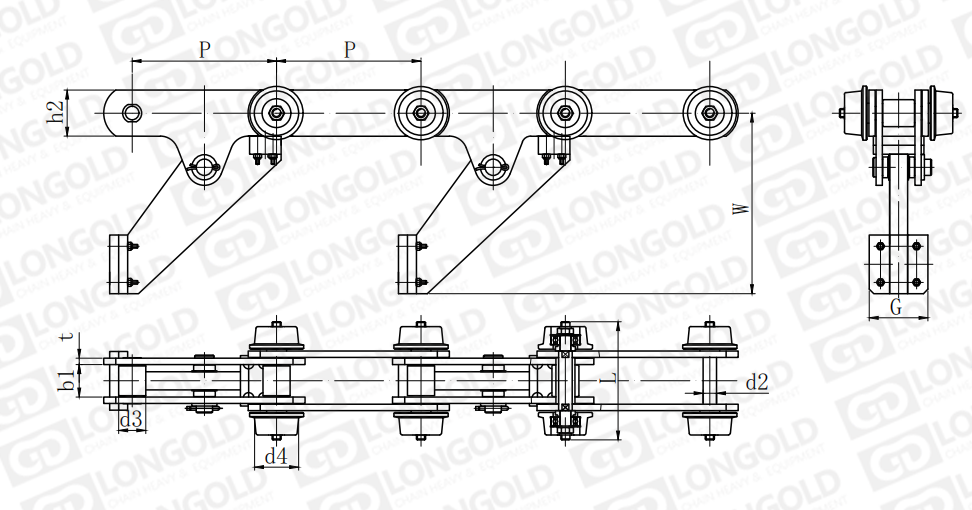 鏈條雙側(cè)帶側(cè)置F滾輪,同時鏈條帶推頭附件。