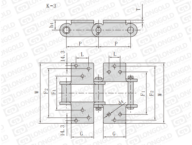 鏈條為套筒鏈,且?guī)3附件,即鏈條兩側(cè)的鏈板帶折彎板,折彎板上各帶三個(gè)孔。
