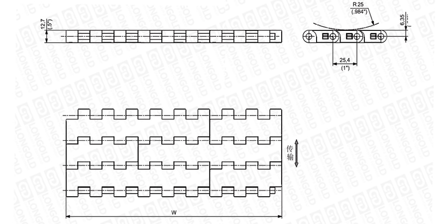 上圖為1"節(jié)距重載網(wǎng)帶與鏈板 USP系列,圖紙中已標(biāo)明部分尺寸。