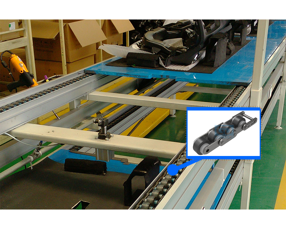 倍速鏈在機械加工輸送工序上可實現(xiàn)積放式輸送,即鏈條連續(xù)運行,而每工位工裝板可等可走。在需要時,工裝板可以在某個工位停留進行加工或操作,而不影響其他工裝板的正常輸送。