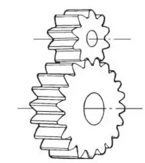 齒生成以螺旋線的方式圍繞在圓柱體上,稱作斜齒輪。斜齒輪是逐漸進(jìn)入嚙合的,比直齒輪傳動(dòng)更平穩(wěn),承載能力更強(qiáng),主要用于對(duì)噪音要求更高的場(chǎng)合,比如汽車、高速傳動(dòng)等。平行軸斜齒輪的效率可達(dá)97%~99.5%,速比通常設(shè)計(jì)在1~10范圍內(nèi),線速度最高可達(dá)200m/s以上(需采用更高的加工精度),支撐軸承同時(shí)承受徑向力和軸向力。