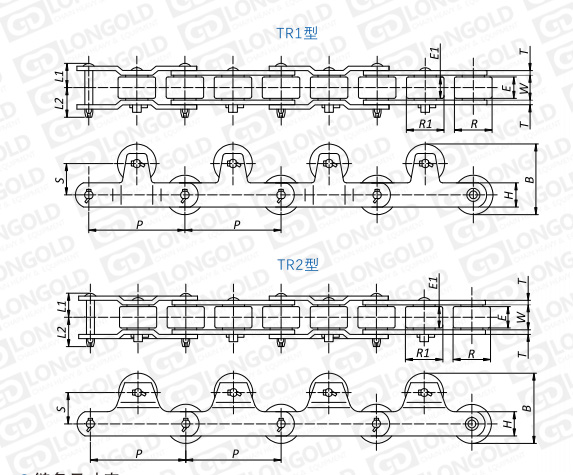 注:帶有標(biāo)注的鏈板不彎曲,所以E1尺寸列表示為PL:20(外鏈節(jié)的滾子寬)、RL:13(內(nèi)鏈節(jié)的滾子寬)尺寸。