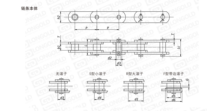 (4)滾子形式:S=小滾子 R=大滾子 B=套筒鏈 F=帶法蘭邊滾子