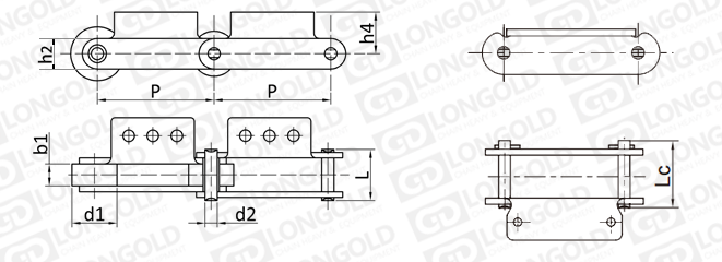 此種輸送鏈?zhǔn)怯呻p節(jié)距鏈條衍生而來的,鏈條節(jié)距為非常用規(guī)格,通過裝備標(biāo)準(zhǔn)附件或非標(biāo)附件使鏈條滿足特定的工作需求。