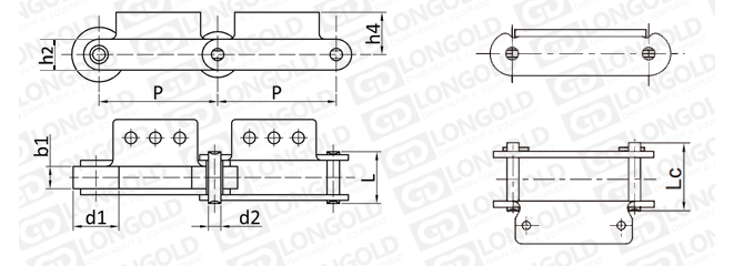 此種輸送鏈是由雙節(jié)距鏈條衍生而來的,鏈條節(jié)距為非常用規(guī)格,通過裝備標準附件或非標附件使鏈條滿足特定的工作需求。