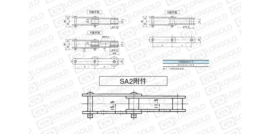 在大型輸送鏈條的單側(cè)加裝直立翼板板附件的鏈條。附件是為了將夾具安裝在鏈條上的零部件,可根據(jù)客戶要求設(shè)定安裝間隔。附件上帶有2個孔,附件表示為:SA2。