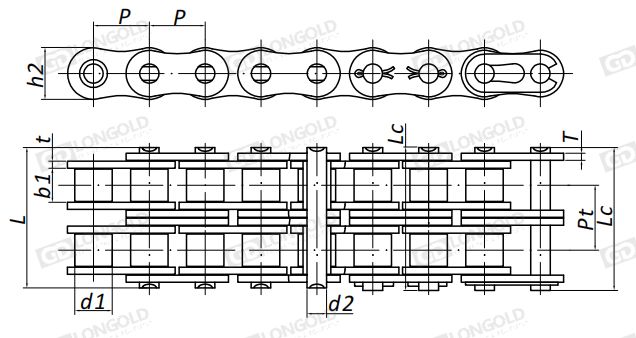 鏈條的三項基本尺寸與A系列標準滾子鏈條相同,但鏈板腰深減小。
