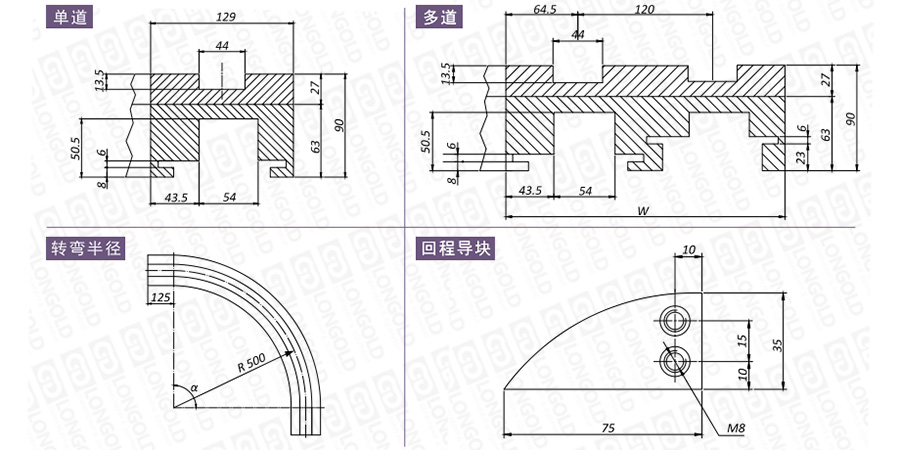 在選擇軌道時,需要考慮安裝尺寸、材質性質、轉彎角度等因素,如有需要,請咨詢隆德技術人員。