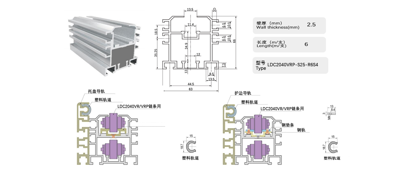 倍速鏈條用鋁制框架,用于滾子部采用工程塑料的倍速鏈條,包括帶蓋罩的倍速鏈條。在鋁制框架的輸送側(cè)小直徑滾子部安裝有鋼軌,可用于所有倍速鏈條。
