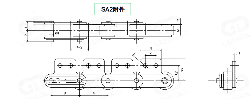 采用特殊工程塑料滾子,與工程塑料制滾子相比,噪音更低。本體為鋼制的雙倍節(jié)距鏈條,在套筒和滾子之間可無加油使用。實現(xiàn)了輕量化和低噪音化。根據(jù)不同的使用要求,本體鏈條可制成通用規(guī)格,NP規(guī)格和SS規(guī)格。鏈條單側(cè)鏈板向上延伸作為附件,附板上帶有一個或者兩個螺孔,附件表示為:SA1和SA2。
