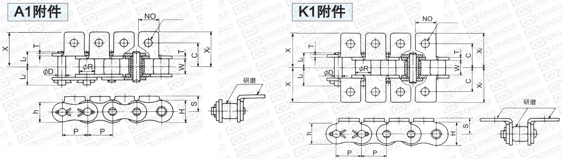 一種對鏈條的附件有相當高要求的產(chǎn)品,要求高是指產(chǎn)品的精度,可以達到客戶的技術(shù)要求與使用要求,A系列小型輸送鏈的滾子為研磨規(guī)格。帶附件鏈條對附件的外表面進行研磨。附件表示為:PG。